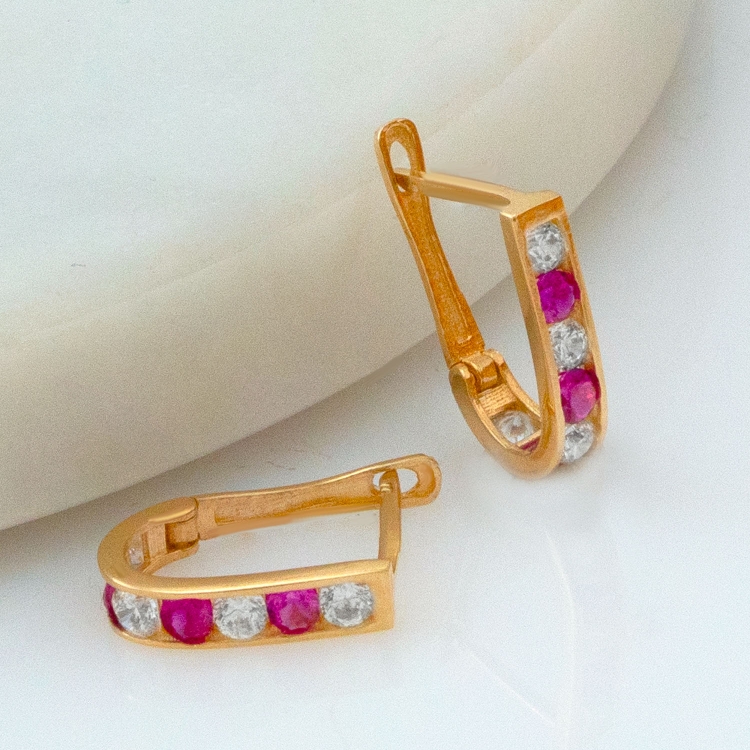 Kolczyki złote przecinki z czerwonymi i i białymi kamieniami KZ856