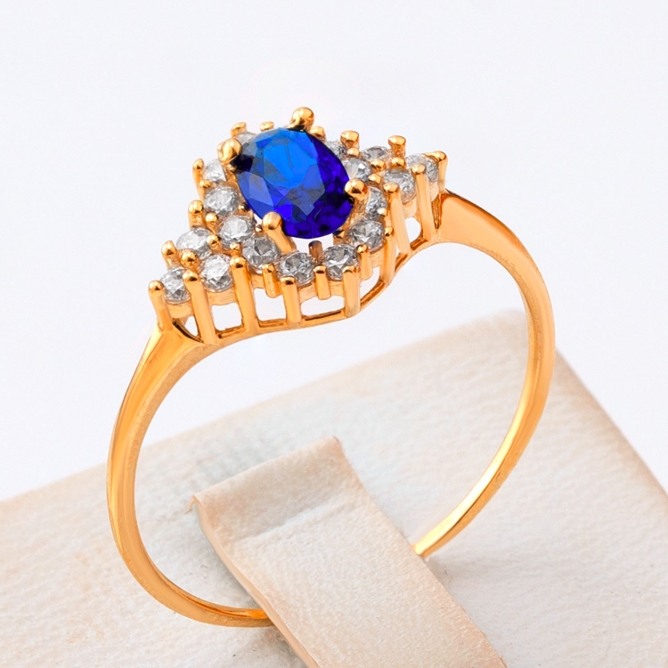 Pierścionek złoty z owalnym granatowym kamieniem i cyrkoniami PIR1772