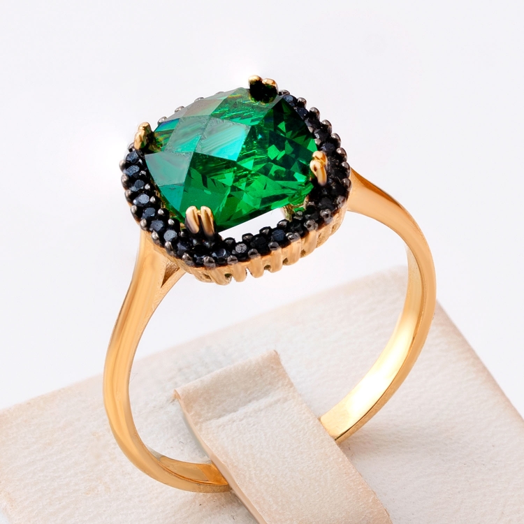 Pierścionek złoty z cernalnym zielonym kamieniem i czarnymi na obrzeżu PIR1771-18