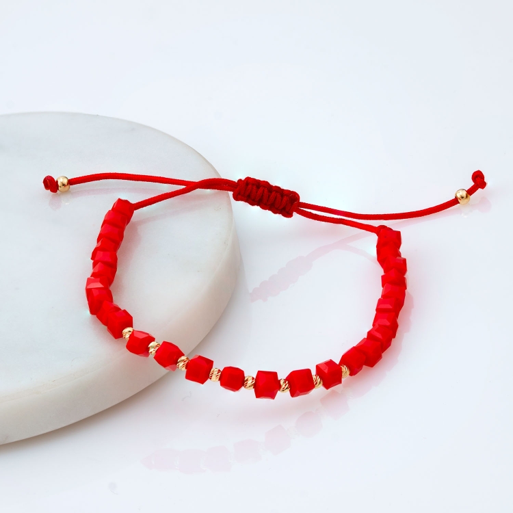 Bransoleta złota na sznurku diamentowane kulki z czerwonymi koralikami BNS321