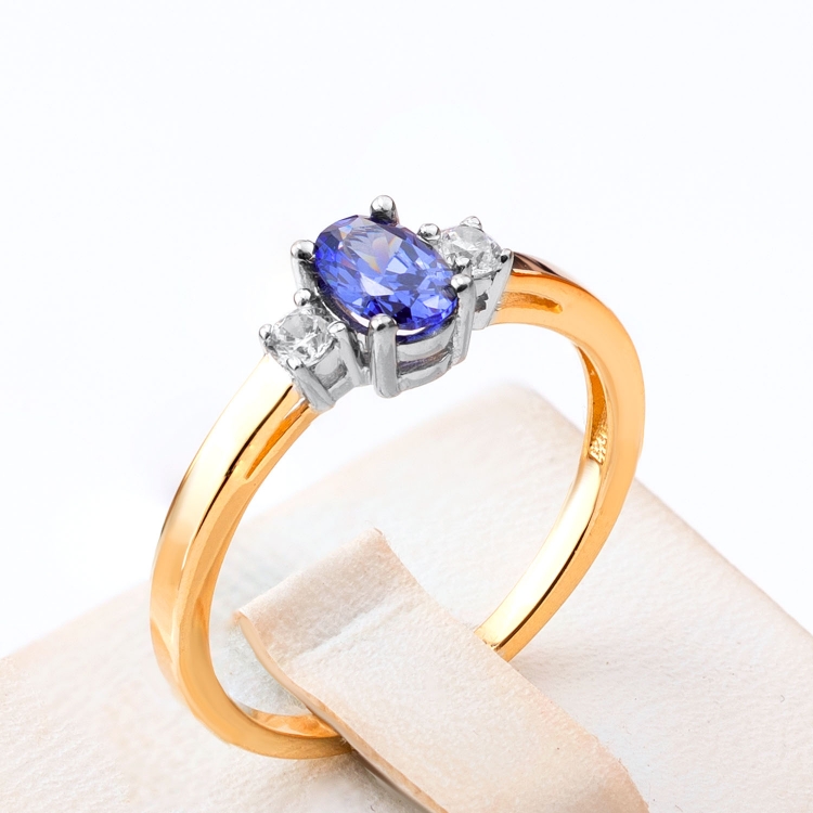 Pierścionek złoty kolorowy owalny kamień w czterech łapkach z cyrkoniami w szynie PIR1804