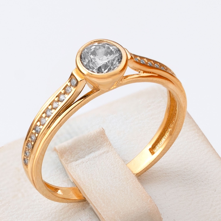 Pierścionek złoty z okrągłą cyrkonią w gładkiej oprawie z cyrkoniami na szynie PIR1821