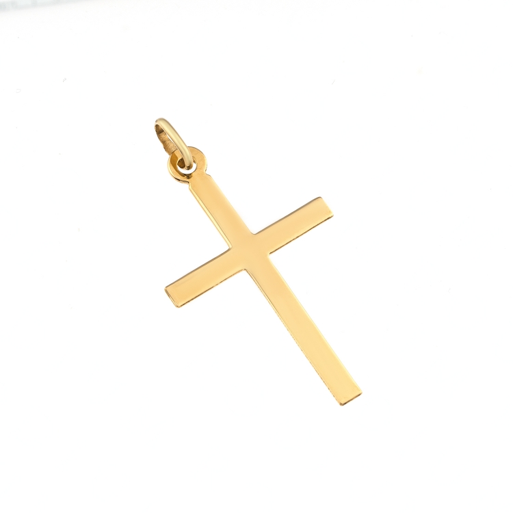Wyrób jubilerski w formie gładkiego, klasycznego krzyża.