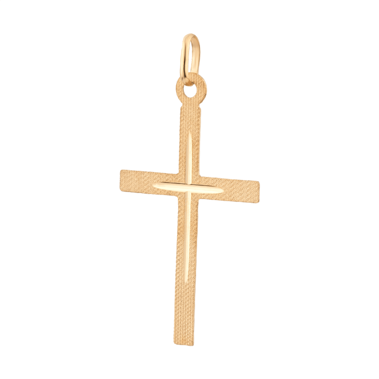 Złoty krzyżyk bez Jezusa z satynowaną kłosową powierzchnią. Wyrób posiada ozdobne diamentowanie na środku wzoru. Tył przedstawionego religijnego wyrobu jest gładki z możliwością naniesienia graweru.