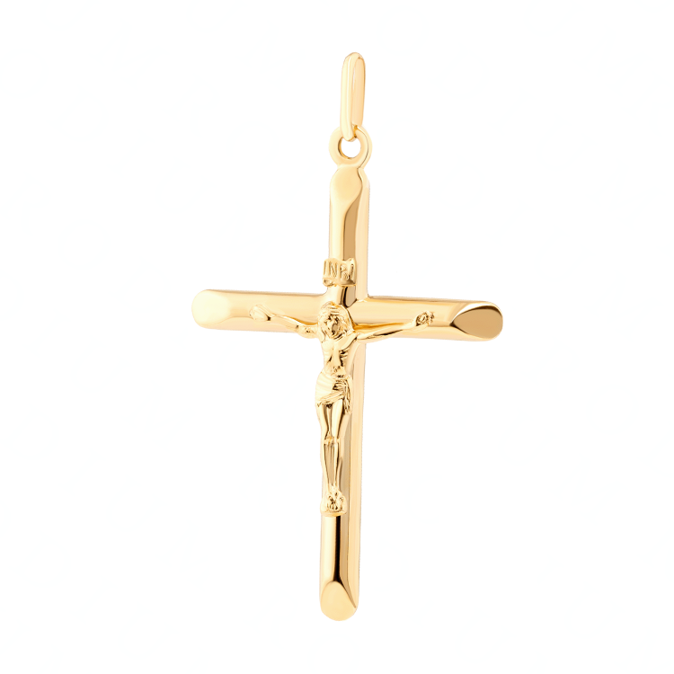 Klasyczny krzyżyk wykonany ze złota próby 585. Wyrób jubilerski z Jezusem, krzyż gładki, błyszczący.