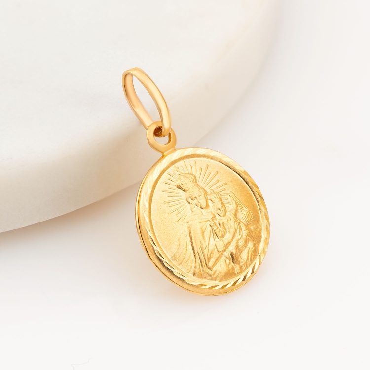 Okrągły medalik wykonany z żółtego złota próby 585, z wizerunkiem Matki Boskiej Skaplerznej
