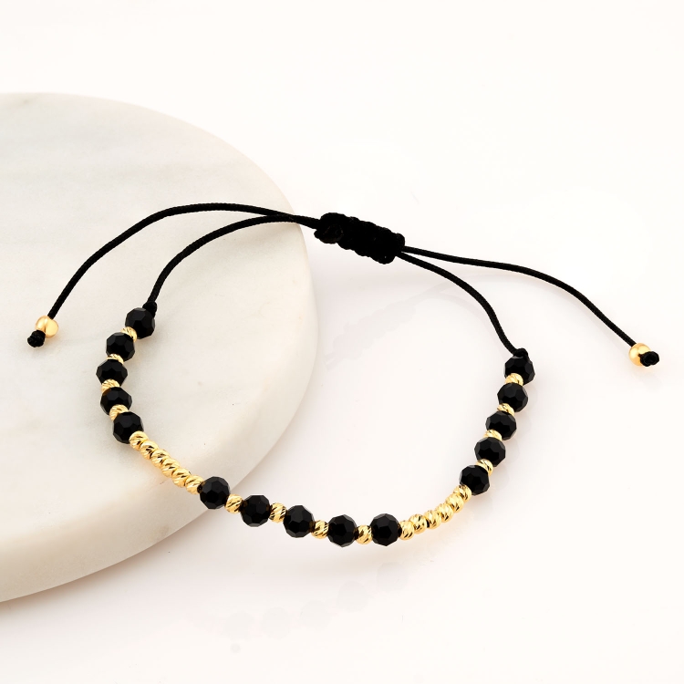 Bransoleta złota na sznurku diamentowane kulki z czarnymi koralikami BNS164