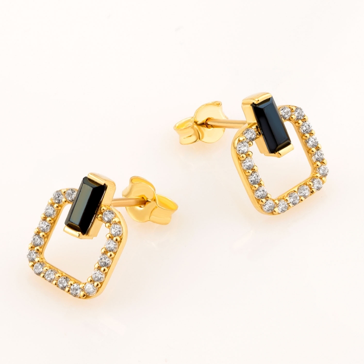 Kolczyki złote ozdobne z cyrkoniami i czarną bagietą KNS979