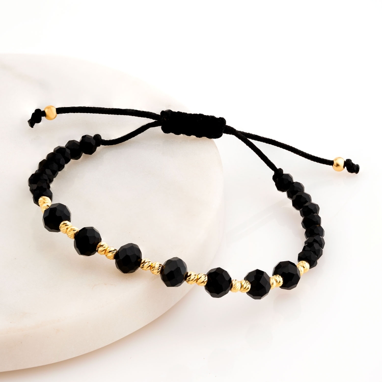Bransoleta złota na sznurku diamentowane kulki z czarnymi koralikami BNS200