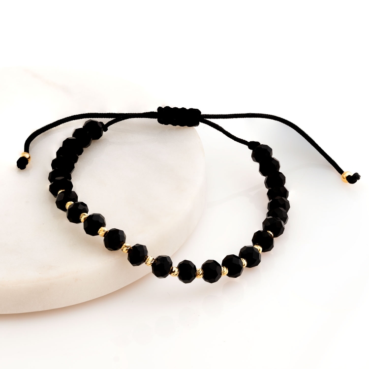 Bransoleta złota na sznurku diamentowane kulki z czarnymi koralikami BNS198