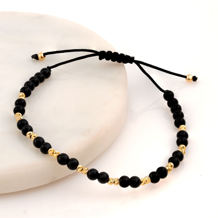 Bransoleta złota na sznurku diamentowane kulki z czarnymi koralikami BNS226