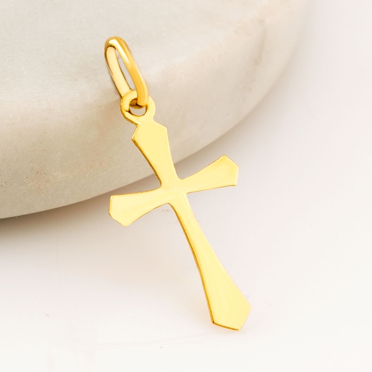 Wyrób jubilerski w formie gładkiego, klasycznego krzyża.