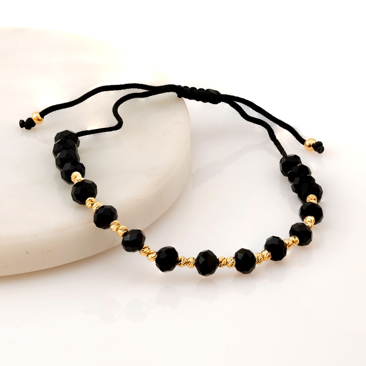 Bransoleta złota na sznurku diamentowane kulki z czarnymi koralikami BNS232