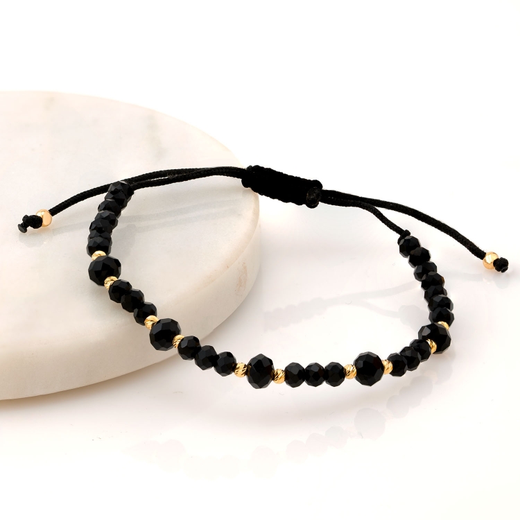 Bransoleta złota na sznurku diamentowane kulki z czarnymi koralikami BNS238