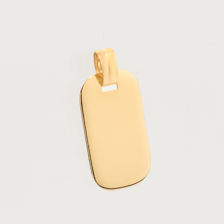 Wyrób jubilerski w formie klasycznej, gładkiej, prostokątnej blaszki z zaokrąglonymi brzegami.