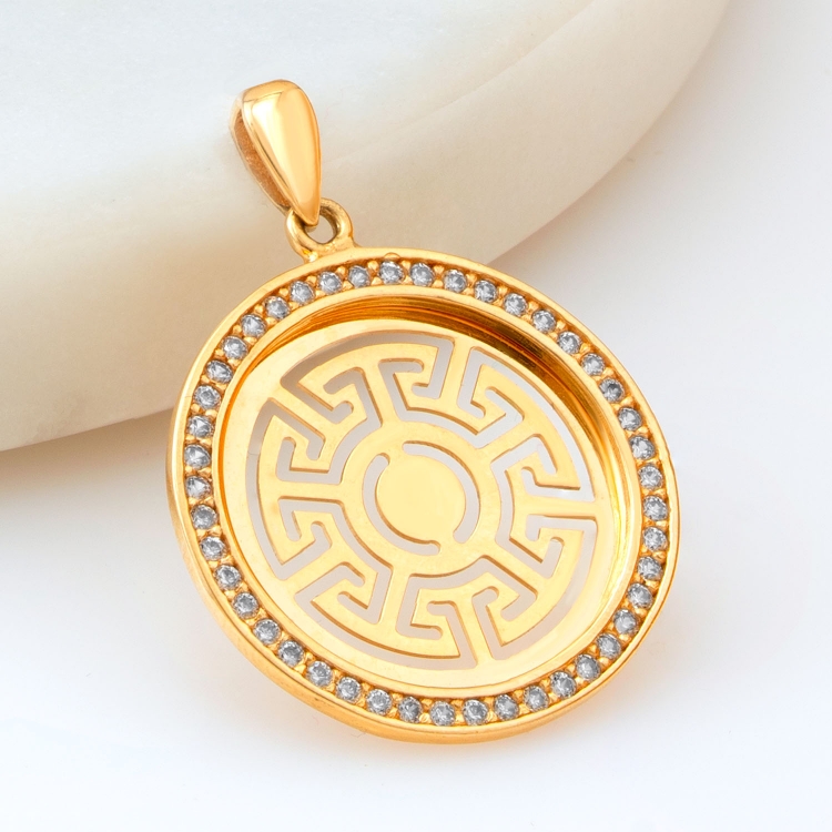 Przywieszka złota okrągła z greckim wzorem i cyrkoniami na obrzeżu PZR1417