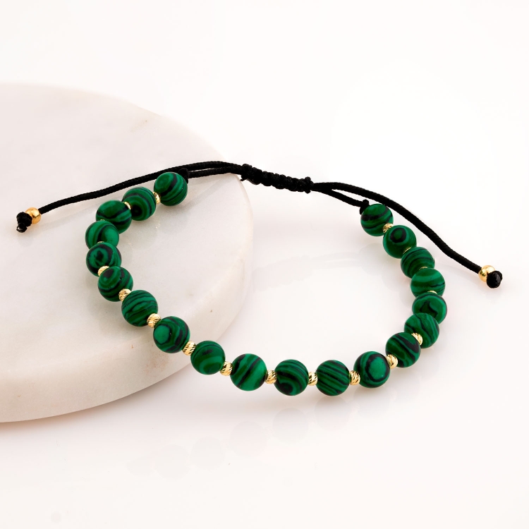 Bransoleta złota na sznurku diamentowane kulki naprzemiennie z zielonymi kamieniami BNS202
