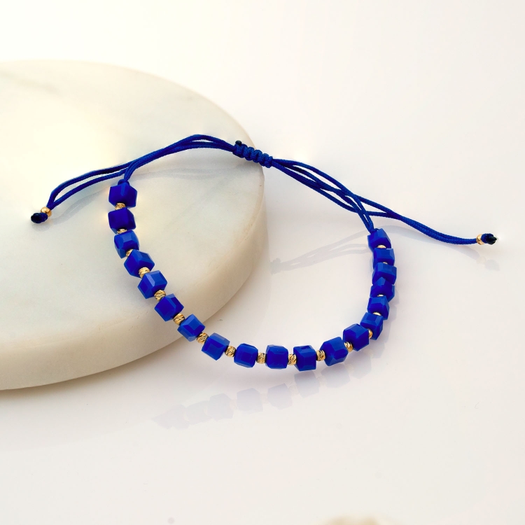 Bransoleta złota na sznurku diamentowane kulki z niebieskimi koralikami BNS288