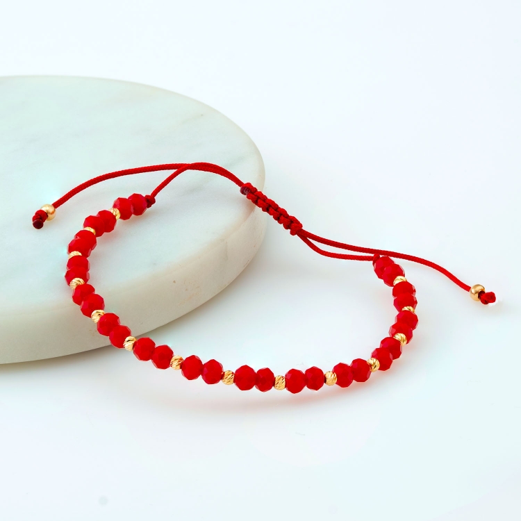 Bransoleta złota na sznurku diamentowane kulki z czerwonymi koralikami BNS300