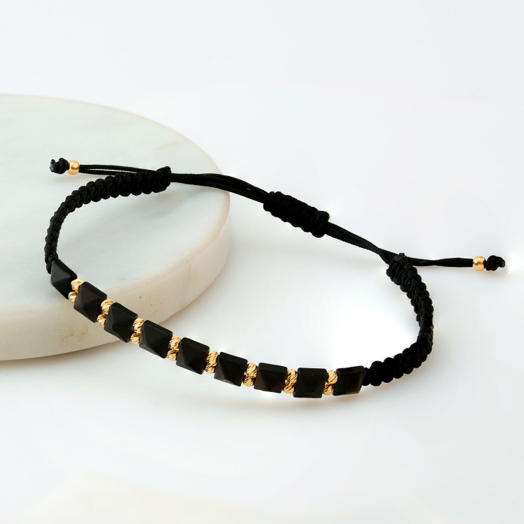 Bransoleta złota na sznurku diamentowane kulki z czarnymi koralikami BNS312