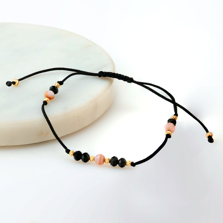 Bransoleta złota na sznurku diamentowane kulki z czarnymi i różowymi koralikami BNS315