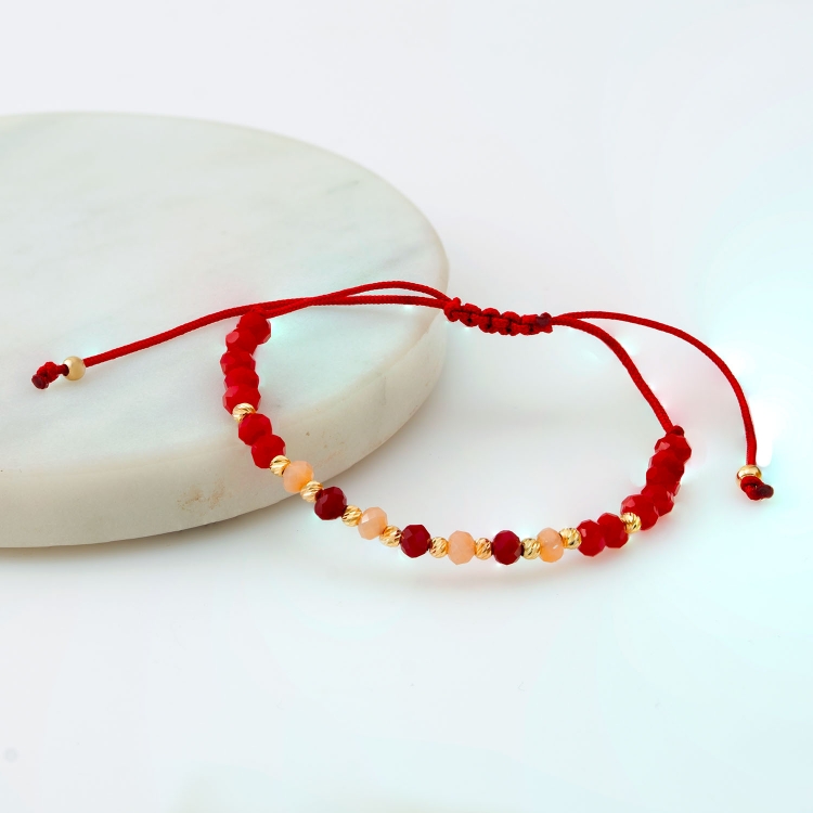 Bransoleta złota na sznurku diamentowane kulki z czerwonymi i i różowymi koralikami BNS305
