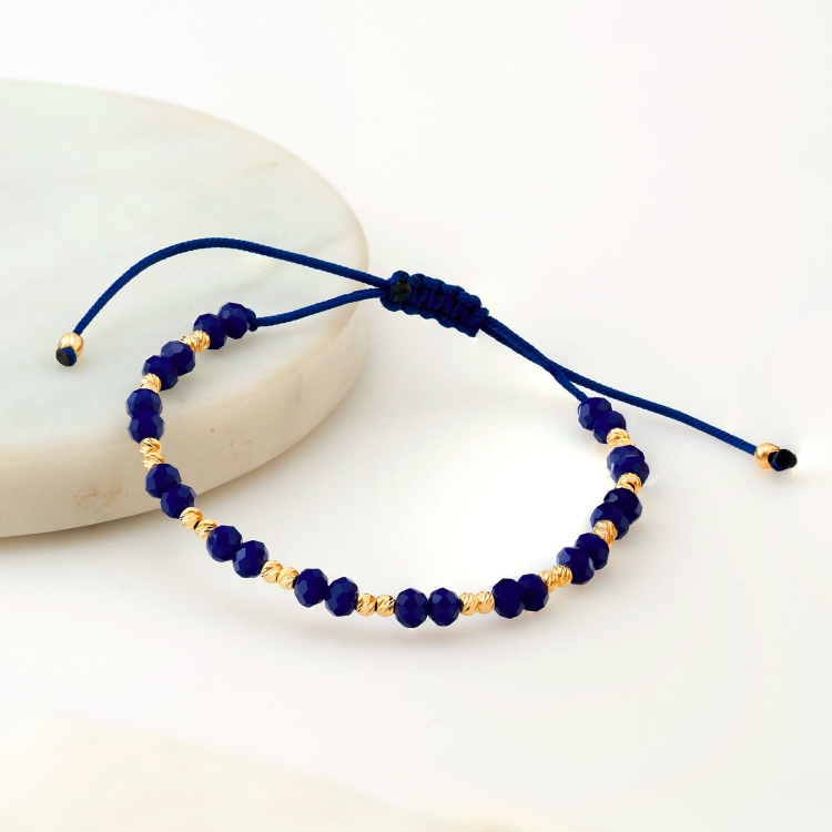 Bransoleta złota na sznurku diamentowane kulki z niebieskimi koralikami BNS308