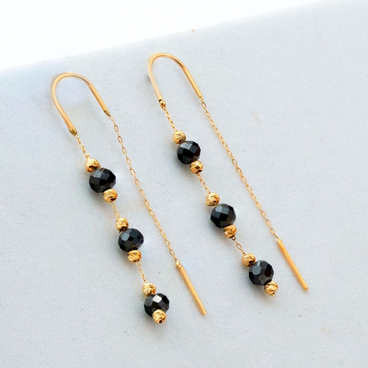Kolczyki złote przeciągane z diamentowanymi kulkami i czarnymi koralikami KPZ147